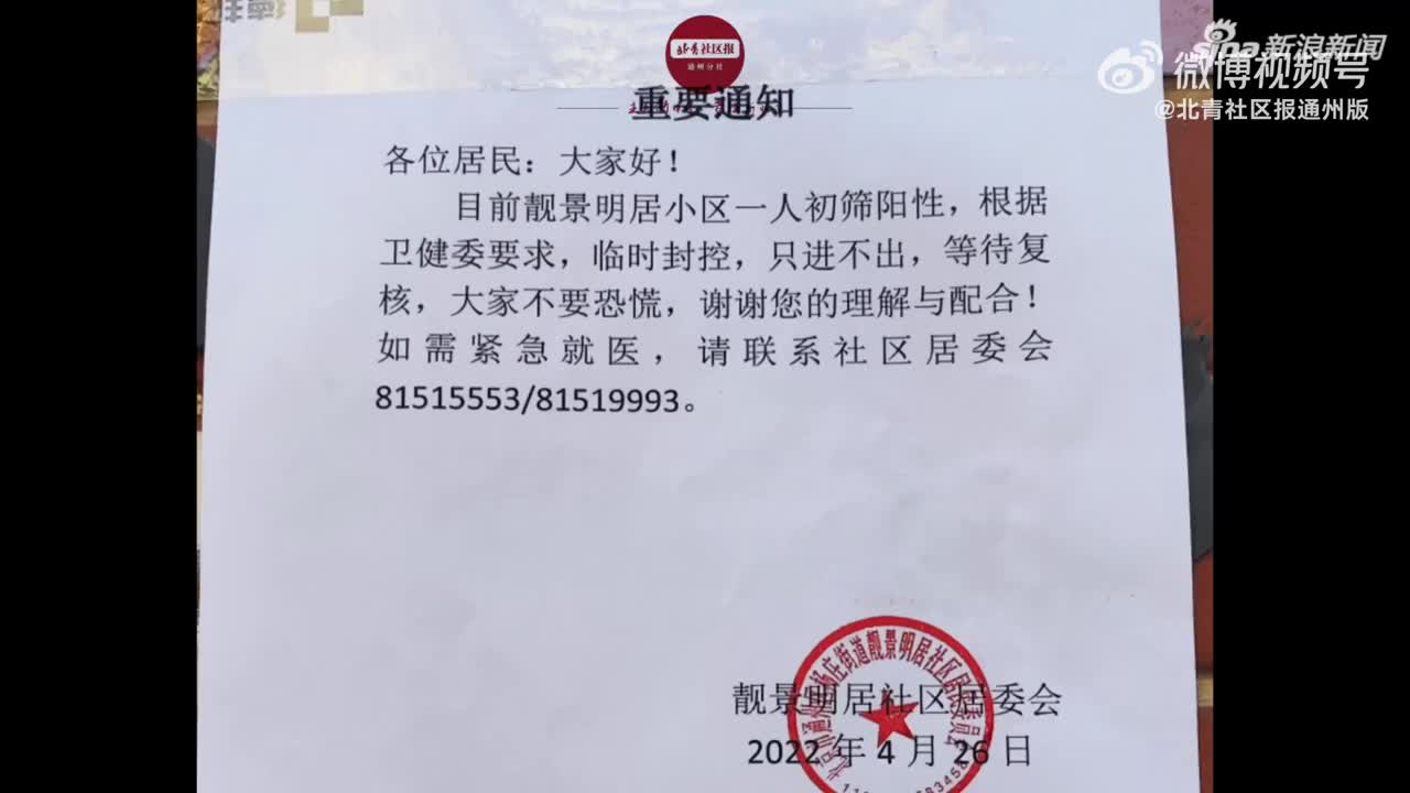 通州靓景明居新增一例初筛阳性,紧急封控,只进不出