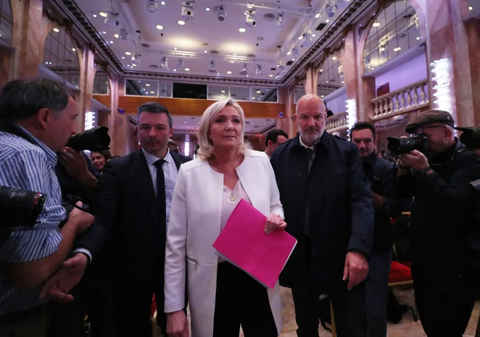 4月13日,法国极右翼政党“国民联盟”候选人玛丽娜·勒庞(前排中)在巴黎出席新闻发布会,介绍其竞选纲领的对外政策部分。新华社记者高静摄