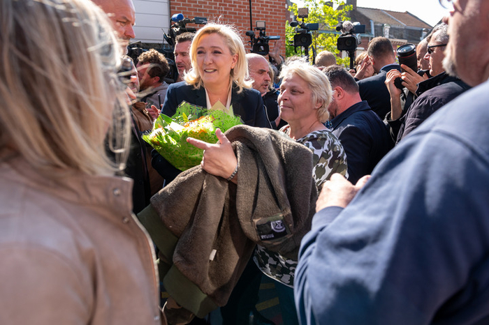 4月24日,法国极右翼政党“国民联盟”候选人勒庞(中左)在埃南-博蒙的一处投票站投票后向民众致意。 新华社发(萨拉·阿勒卡莱摄)