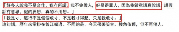 就在去年11月,早已年过八旬的曾江罕见地接受媒体采访也曾提到这一点。他直言:“我确实很嚣张(原话是粤语‘寸’,就是嚣张的意思)。这一行不是人人敢嚣张,不是我嚣张得起,而是我敢嚣张。”曾江当时说,自己并不介意被别人说难相处,“因为我确实不会做人,容易得罪人,我太喜欢说真话,说假话没意思,假的要慢慢想,真的不用想。”