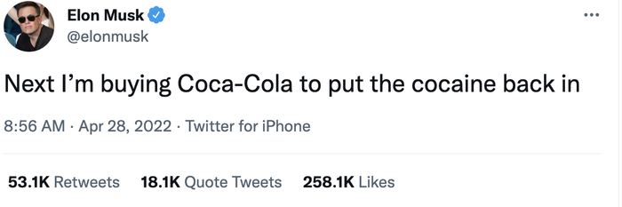 北京时间28日8点56分,马斯克发推文称,“接下来我要收购可口可乐公司,再把可卡因重新加进去。”