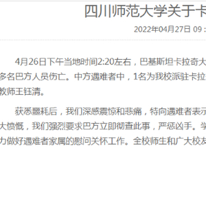 4月27日,四川师范大学在其网站上发布《关于卡拉奇大学孔子学院班车遭遇恐怖袭击的声明》。据该声明,4月26日下午当地时间2时20分左右,巴基斯坦卡拉奇大学孔子学院班车在校内遭遇恐怖袭击,目前已造成3名中方教师遇难,1名中方教师受伤,另有多名巴方人员伤亡。中方遇难者中,1名为四川师范大学派驻卡拉奇大学孔子学院中方院长黄桂平,另外2名遇难者为公派教师丁沐舫、志愿者陈赛,伤者为公派教师王钰清。