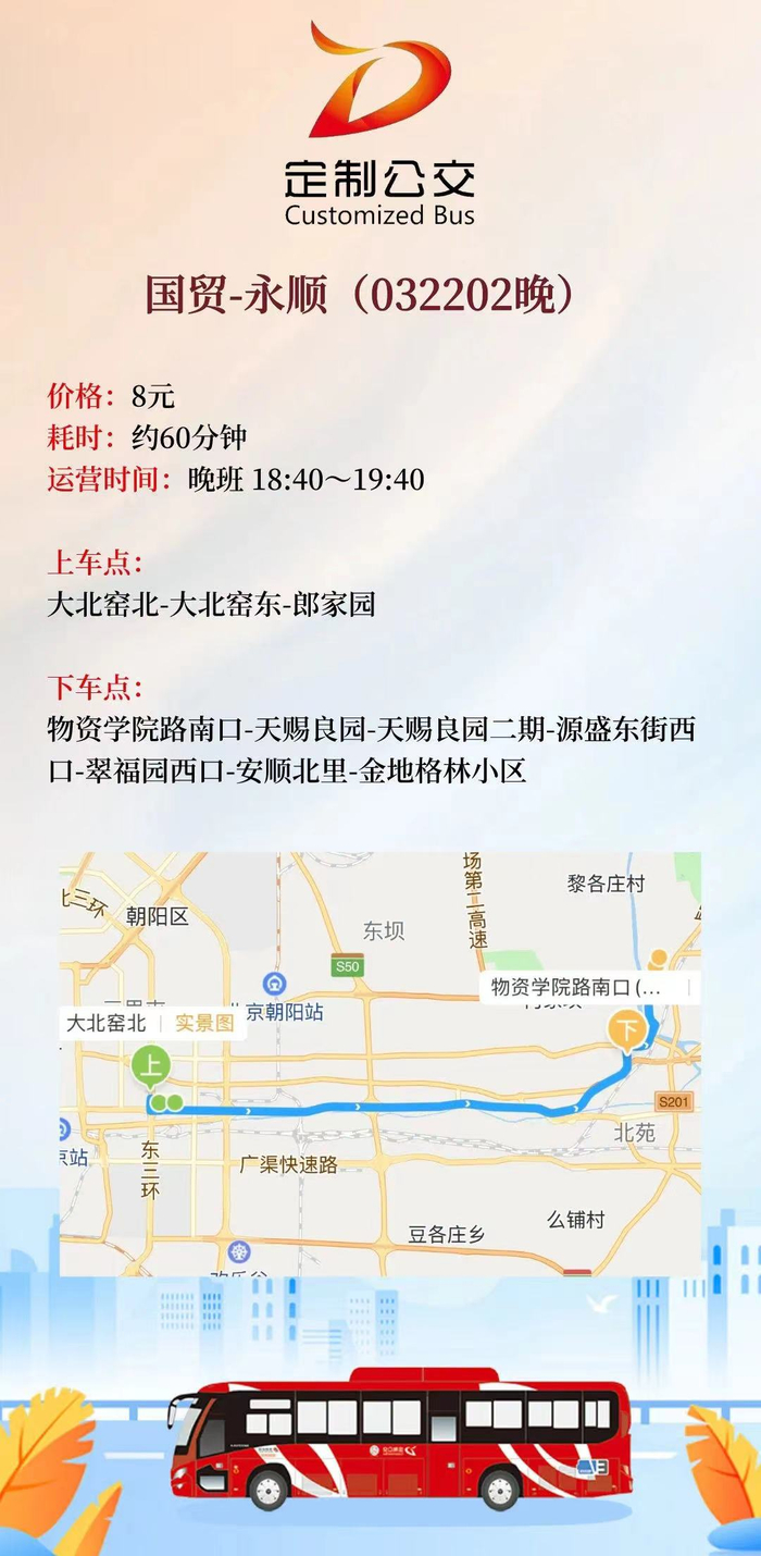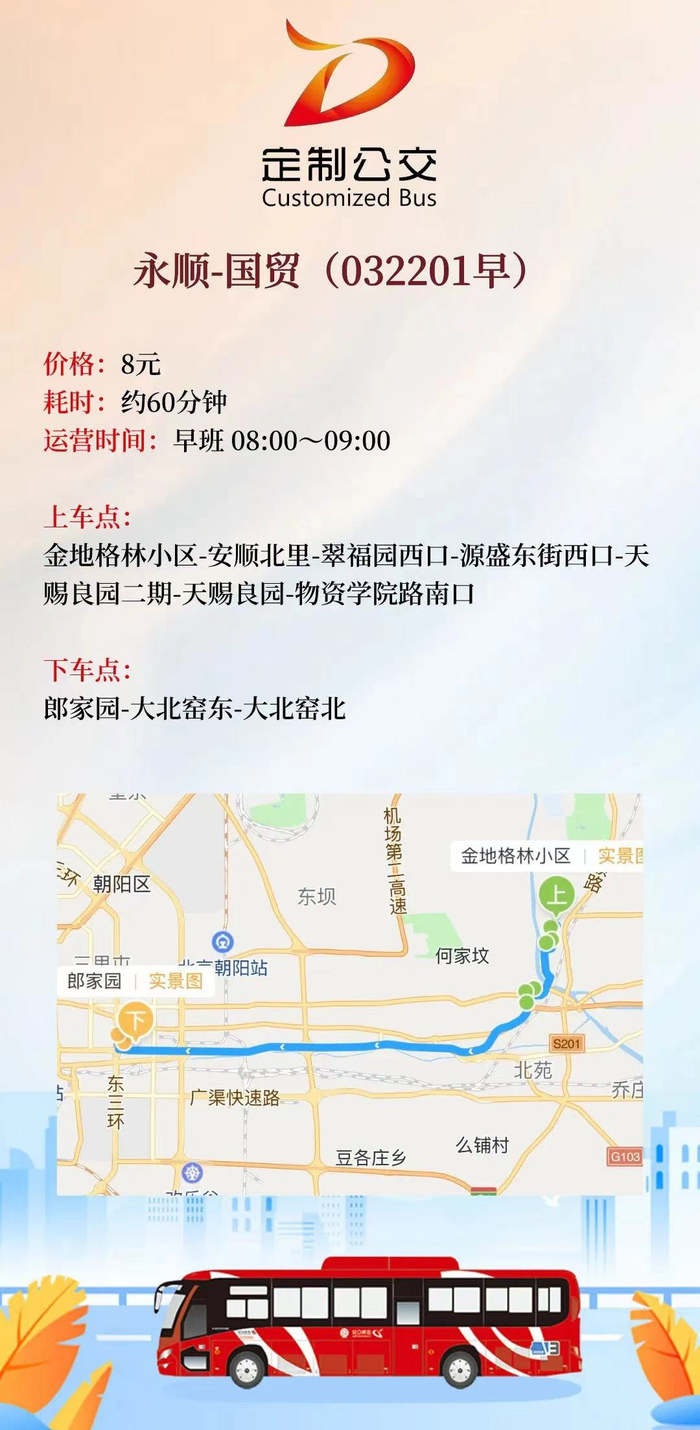 上车站点:金地格林小区,安顺北里,翠福园西口,源盛东街西口,天赐良园二期,天赐良园,物资学院路南口