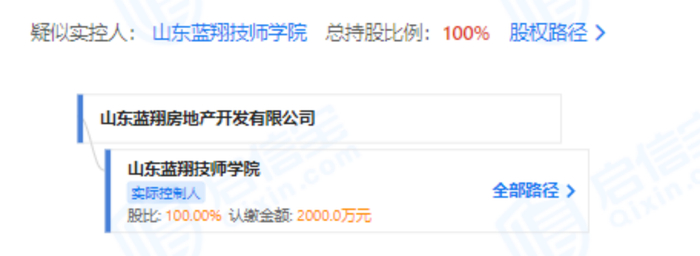 启信宝显示,山东蓝翔房地产开发有限公司为山东蓝翔技师学院独资控股的全资子公司,山东蓝翔技师学院的法人代表为荣兰祥。