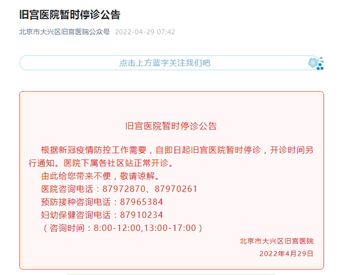 北京市大兴区旧宫医院暂时停诊 新京报 新京报官方账号 2022.04.2914:08 关注 新京报讯 据北京市大兴区旧宫医院公众号消息,根据新冠疫情防控工作需要,自即日起旧宫医院暂时停诊,开诊时间另行通知。医院下属各社区站正常开诊。
