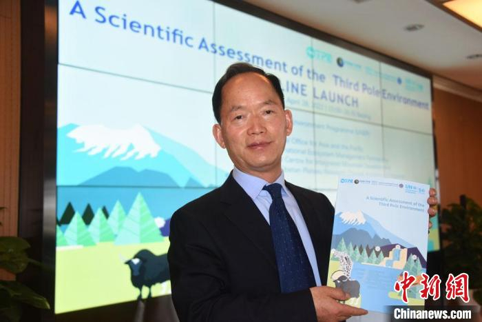 《第三极环境科学评估报告》主笔之一、中科院院士、中科院青藏高原所研究员姚檀栋在发布会上展示报告。 中新社记者 孙自法 摄