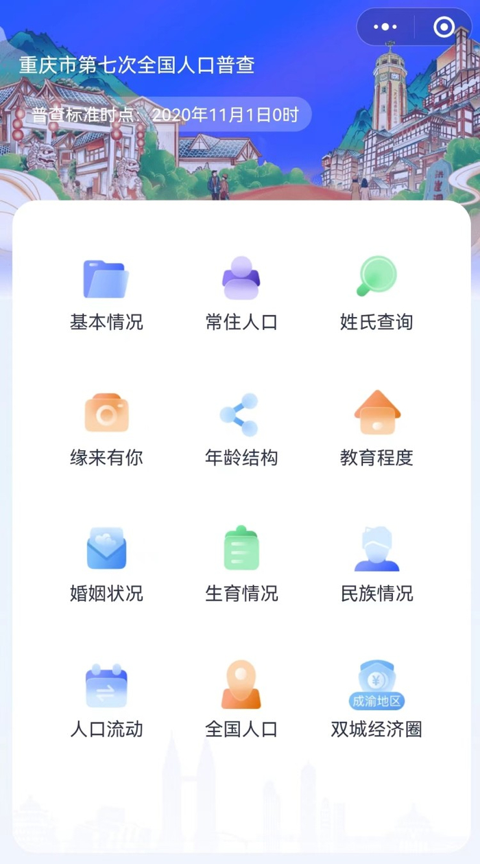 近日,重庆市统计局面向广大市民朋友推出了重庆七人普数据小程序,小程序有12个功能区,涵盖了重庆市第七次全国人口普查的主要数据。在这里,不仅能查询到全市和区县常住人口数量、年龄构成等,还能查询与你同名同姓,乃至同年同月出生的“有缘人”。