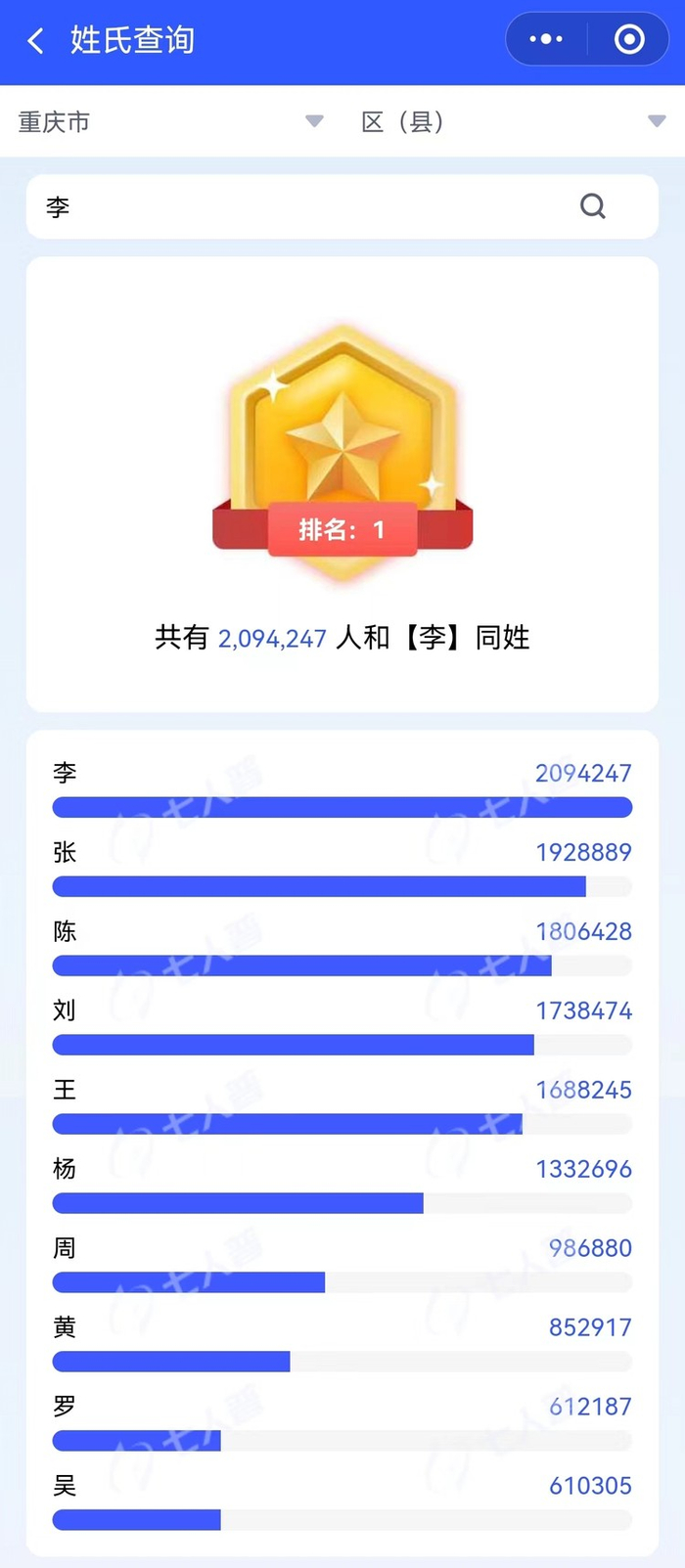 点开“姓氏查询”,发现在重庆,“李”姓人数高居榜首,共有2094247个。其次是“张”和“陈”,分别为1928889人、1806428人。在该板块,输入你的姓氏,不仅能知道你的姓氏在重庆、各区县的人数排第几,还能看到全重庆及各区县有多少和你同姓的人。