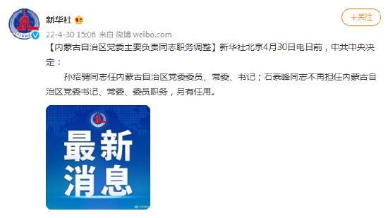 孙绍骋同志任内蒙古自治区党委委员、常委、书记;石泰峰同志不再担任内蒙古自治区党委书记、常委、委员职务,另有任用。