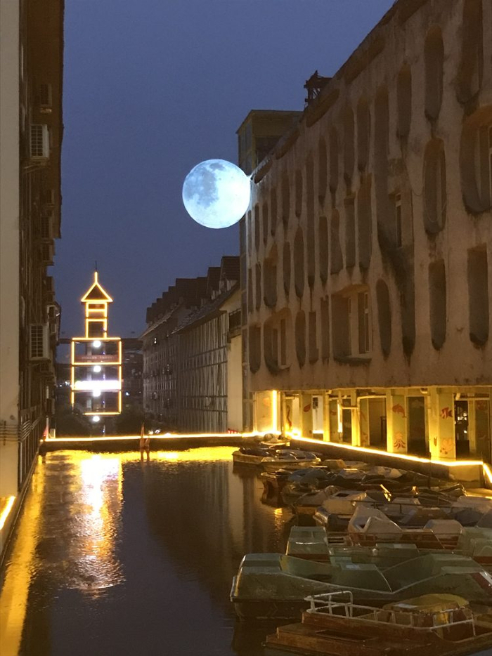值得一提的是,借助超级月亮与建筑轮廓,让科技与艺术完美融合,呈现一幅《月照威尼斯》的神奇景象,这个景点也是运河公园拍照的唯美画框,人在船中坐,船在画中游,美轮美奂。