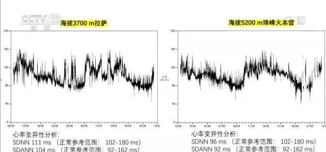 北京大学环境科学与工程学院王腾:这张图的结果,就是我们通过叫做心率贴片,进行的24小时心电监测的结果。拉萨的时候,我们记者佩戴心率贴片的结果,是111和104。大本营的时候,分别是96和92毫秒。在(海拔)3700米的拉萨,到达(海拔)5200米的大本营之后,心率变异性是有所降低的,降了10%左右。