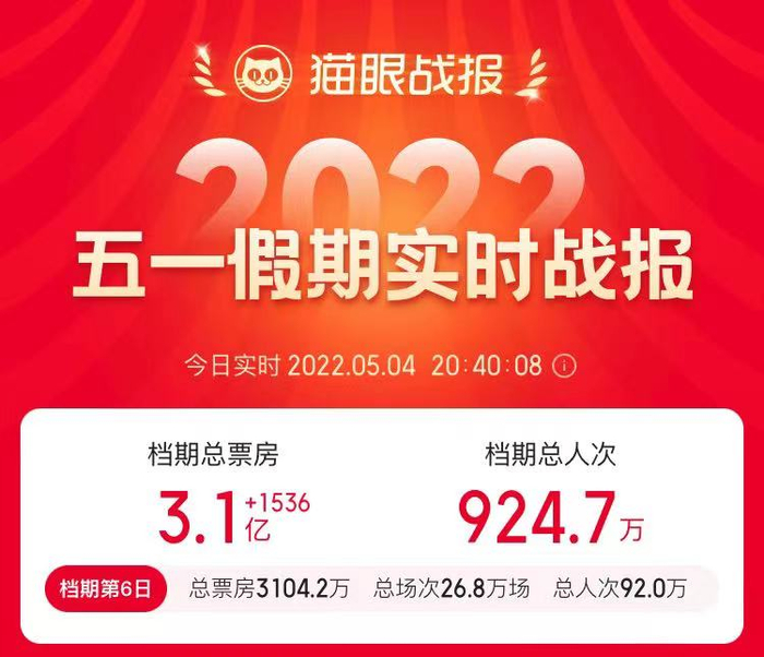 目前来看,受疫情影响,今年的“五一”档成绩很难超过4亿元票房,难以企及2021“五一”档16.73亿元和2019年“五一”档15.27亿元的票房相比,不过随着全国影院营业率已经恢复到近七成,创下近一个半月以来的新高,从5月13日开始的520档期将有10部左右的电影上映,票房仍然令人期待。