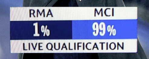 值得注意的是,直到本场比赛第89分钟,皇马仍在总比分上以2球落后。电视转播方的实时胜率甚至已经宣判了前者的“死刑”。