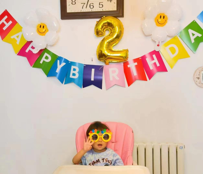 孩子爷爷奶奶用蛋糕店赠送的气球、卡片装扮了一面生日墙,小予乐坐在生日墙前面的椅子上,小小的卡通眼镜戴在脸上。柳怡伦说:“孩子的生日氛围感有了,这也稍稍弥补了我没能陪孩子的遗憾。”