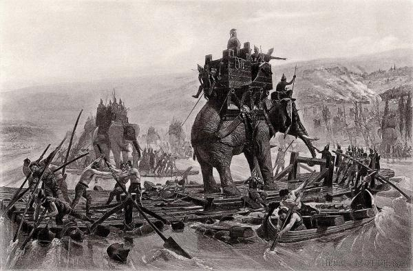 迦太基名将汉尼拔·巴卡(Hannibal Barca)横渡罗纳河,by Henri Paul Motte,1878,西西里沦陷使汉尼拔及其军队在意大利陷入孤立。