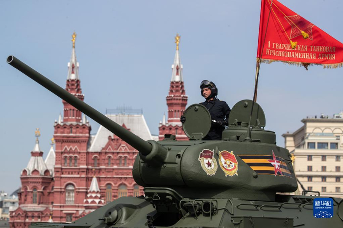 5月7日,在俄罗斯首都莫斯科,一辆T-34坦克驶过红场。新华社记者 白雪骐 摄