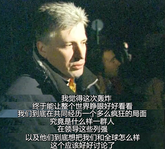 他说他正在贝尔格莱德大厦,那是一座超过20层的建筑,所以他从高层能看到中国使馆着火了。他接着补充道:“我们好像击落了美国飞机,然后美国飞机掉在了中国大使馆上,导致火灾。”