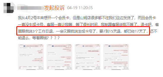 4月黑猫投诉平台有大量针对山姆会员商店的投诉,较多消费者反映申请退会员费,从商家指定退款渠道进入,商家承诺7-10个工作日后到账,但用户未如期收到。询问客服也不予应答,260元会员费迟迟无法退还。截至4月底,山姆会员商店仍积压602单投诉尚未回复,问题多涉及食品安全、会员权益等问题。