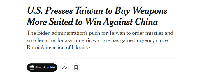 《纽约时报》7日援引9个匿名的现任及前任美台官员的话说,比起常规战争武器,拜登政府正悄悄施压台湾,向美国订购“能帮助台湾小规模军队击退解放军海上入侵的美国制武器”。俄乌冲突爆发后,华盛顿和台北相信北京在未来几年“入侵台湾”已成为潜在危险,而小规模军队如果采用机动性高及精准打击的“不对称战术”,并且使用正确武器,也能够击退大规模军队。