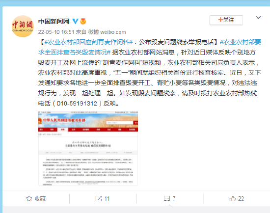 农业农村部回应割青麦作饲料:公布毁麦问题线索举报电话