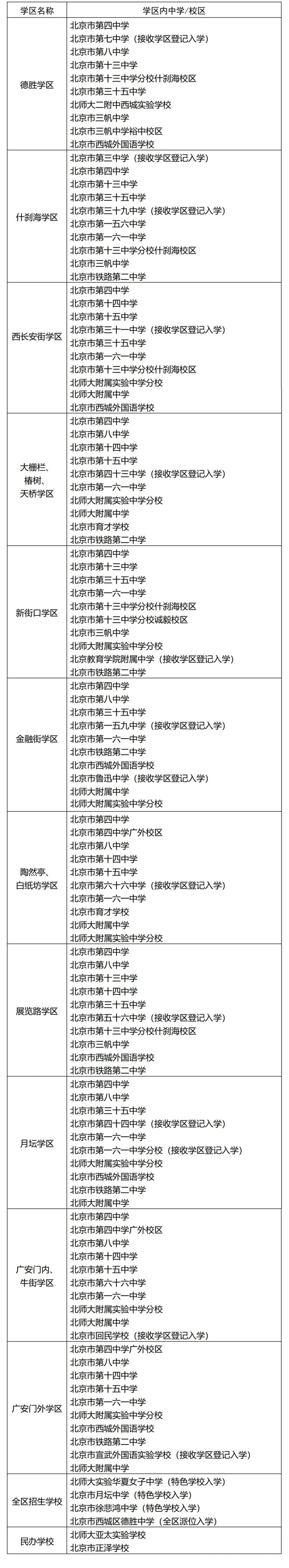 2022年西城区义务教育阶段学区初中一览表