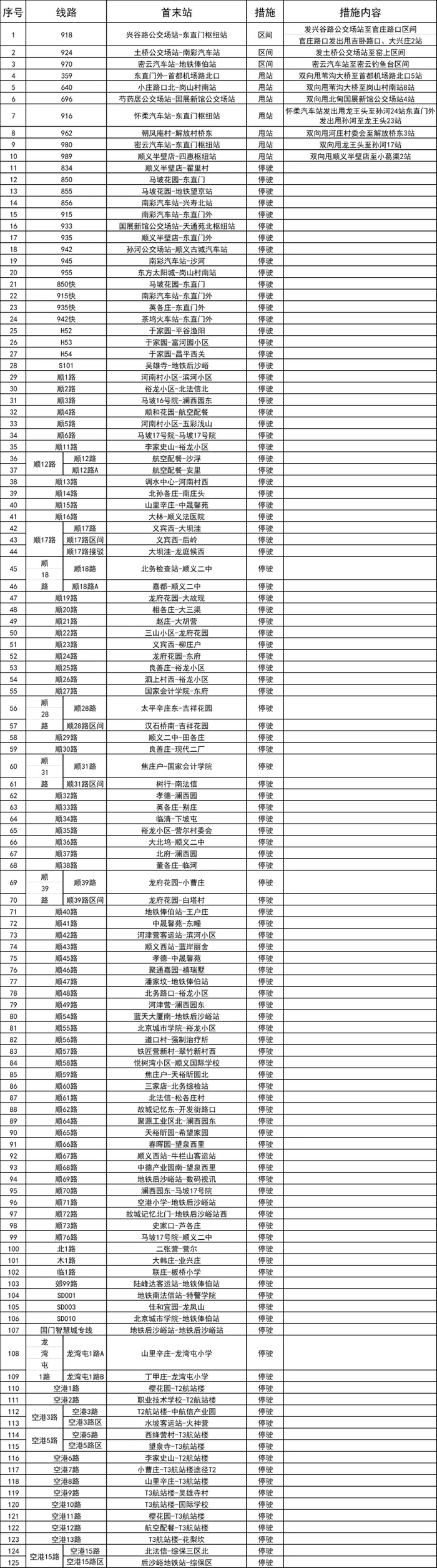 自5月12日首车起,公交集团途经顺义区的全部28条公交线路,顺义区97条区域公交,采取区域外区间、甩站、停运等措施,其中:区域外区间措施3条,甩站7条,停驶措施115条(附图)。