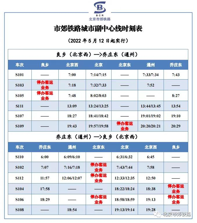 自2022年5月12日首班车起,市郊铁路城市副中心线良乡站、北京东站,通密线顺义站、牛栏山站暂停办理市郊铁路客运业务。
