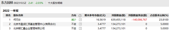 Wind资料显示,截至今年一季度,何巧女仍是东方园林的第一大股东,持股比例为23.81%。