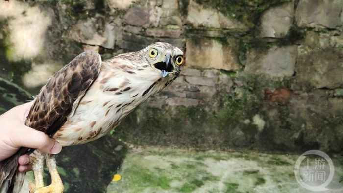 凤头鹰是市民发现的,当时,这只凤头鹰头部出现撞伤,经过重庆动物园十多天的救护,已能正常生活。