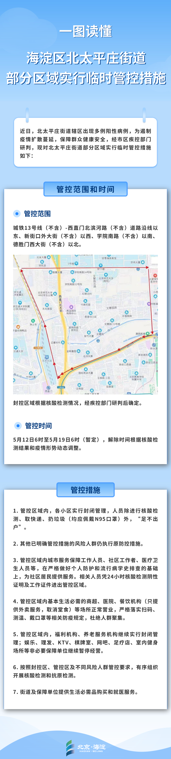 为遏制疫情扩散蔓延,保障群众健康安全,经市区疾控部门研判,5月12日6时至5月19日6时(暂定)对北太平庄街道部分区域实行临时管控。