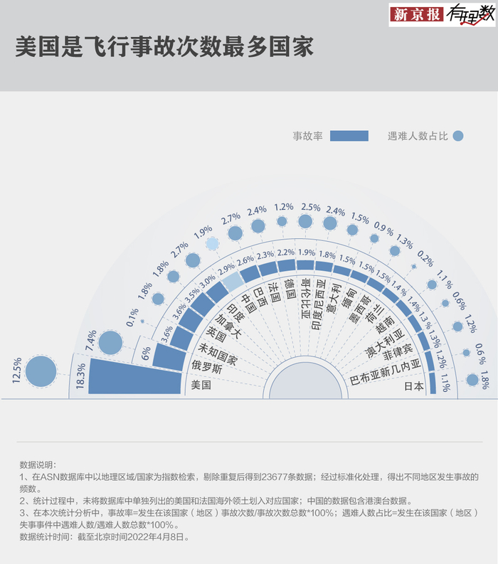 相比之下,在中国境内发生的航空事故只有669起,排在第六位,而且相比事故多发前20的国家,在中国的遇难人数要小于其他国家。