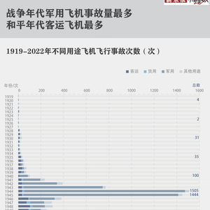人类历史上飞机失事的第一个高峰是在二战时期,在上世纪40年代,飞机作为重要飞行工具被大量应用到二战中,1944年和1945年事故量分别达到1505起和1444起,平均每天都有4架飞机发生事故,之后随着战争结束事故量逐渐降低。