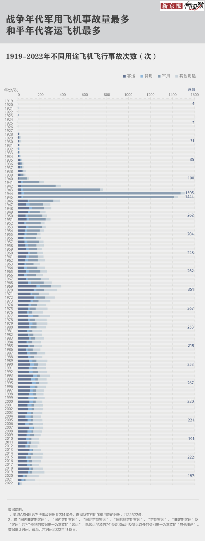 从1919年到2022年3月21日的东航MU5735失事期间,两万多次事故里有明确标记的遇难人数达到12.7万,其中客机失事造成的人员死亡有8.4万,是按用途分遇难人员最多的种类。