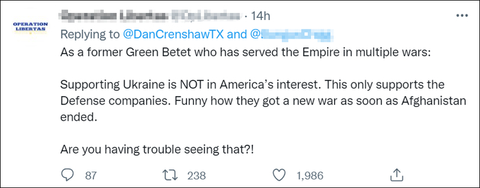 “作为一名曾在多场战争中为国家效力的前绿色贝雷帽(指美国陆军特种部队成员)要说:支持乌克兰不符合美国的利益。这只有利于国防公司。有趣的是,阿富汗战争一结束,他们就发动了一场新的战争。你看不清楚吗?!”