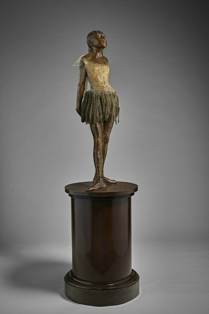 曾摆放于巴斯夫人寓所玄关位置的两件经典杰作,埃德加·德加的青铜雕塑《14 岁的舞者》和巴尔蒂斯的《窗边的女孩》均是描绘年轻的少女,宣示她们所占据的空间属于女性,同时促使访客反思女权的各种表现形式。其中,埃德加·德加的《14 岁的舞者》是现代艺术中最知名的雕塑作品之一,也是德加创作的最大雕塑作品,也是他一生中唯一选择展出的作品。1881年,在巴黎第六届印象派展览上,这件三分之二真人大小的年轻芭蕾舞演员的形式新颖,形象大胆,引起了轰动。正如舞者摆出一副顽强反抗的姿势一般,该作品也可被视为一个大胆的视觉宣言,体现了艺术家自身坚定的前卫的独立性。(这件原版蜡像雕塑约于1879至1881年铸造,而巴斯夫人收藏的版本则由Hébrard铸造厂于1927年8月受委托铸造。)而作品《窗边的女孩》是巴尔蒂斯于1954年至1964年间以三个青春期的姐妹为主题创作的群像之一,也展现了巴尔蒂斯对单个主题的深入刻画。