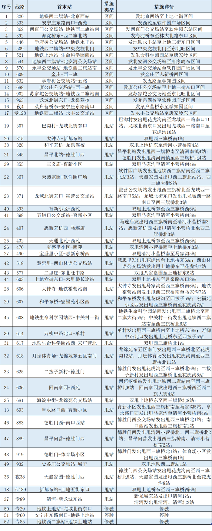 途经海淀区清河街道及周边划定重点区域的52条公交线路,采取甩站、区域外区间、停驶等措施。