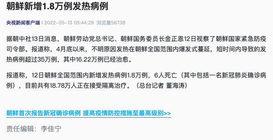朝鲜一天新增1.8万发热病例 死亡6例 4月底以来发热病例已超35万例(每日经济新闻)