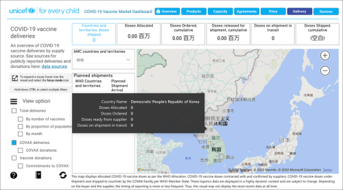联合国儿童基金会(UNICEF)的新冠疫苗市场统计平台的数据显示,没有任何疫苗被分配给朝鲜,也没有已发货或待发货的疫苗,所有数据均为零。