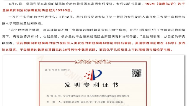 中国科学家发现新冠治疗新药:药物提取自中药活性成分( 北京日报)