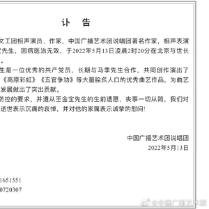 中新网客户端北京5月14日电 中国广播艺术团14日发布讣告称,中国广播艺术团说唱团著名作家,相声表演艺术家、原铁道兵文工团相声演员、作家王金宝,因病医治无效,于2022年5月13日凌晨2时20分在北京与世长辞,享年85岁。