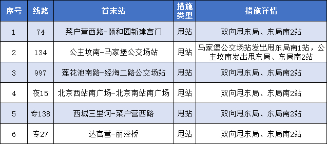 自5月14日起,途经丰台区丽泽雅园管控区的6条公交线路采取甩站措施。后续将配合封控采取线路临时调整措施,由此给您出行带来不便,敬请谅解!