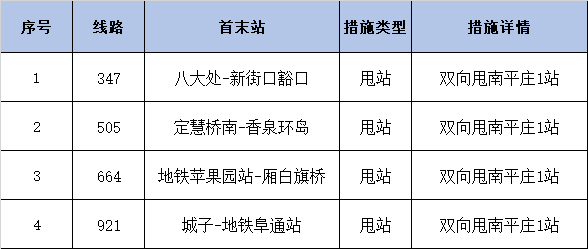 自5月14日首车起,途经海淀区四季青镇西山村东平庄管控区的4条公交线路采取甩站措施。后续将配合封控采取线路临时调整措施,由此给您出行带来不便,敬请谅解!