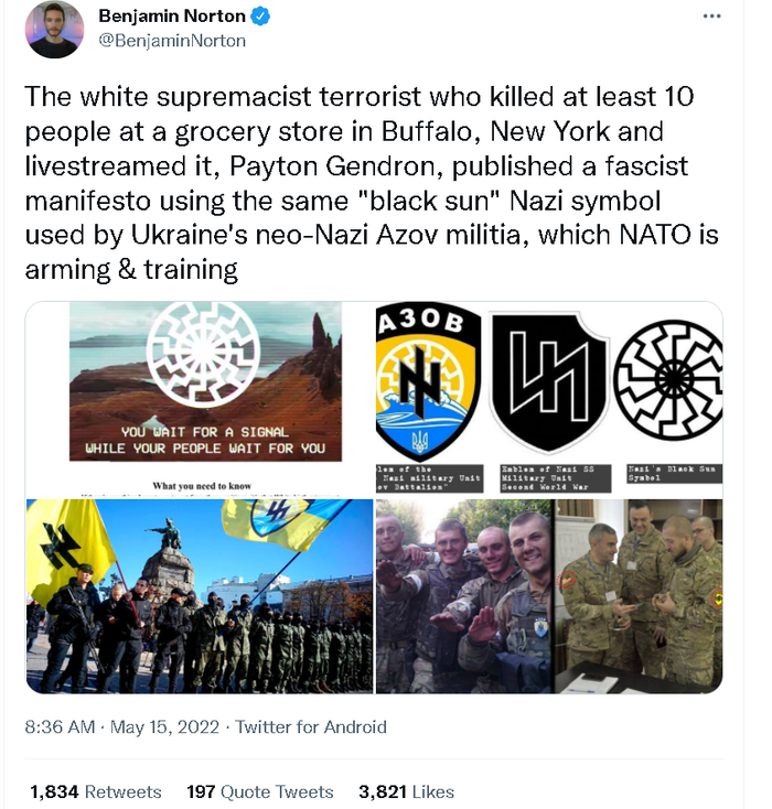 可不论在美西方眼中俄乌军事冲突谁是谁非,他们都不该回避“亚速营”的新纳粹极端主义本质。否则,今天这起布法罗市的恐怖袭击案件,只会不断重演——因为这些受亚速营影响的极端白人分子,只会不断反噬美国和西方自己。