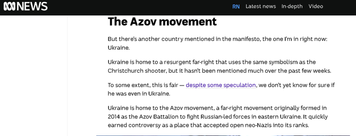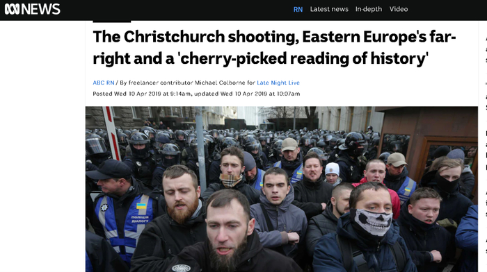 此前,在2019年新西兰那场恐怖袭击发生后,澳大利亚准官办媒体“澳大利亚广播公司”曾在报道凶手塔兰特的极端思想和他所使用的“黑太阳”新纳粹主义徽记时,重点介绍了来自乌克兰的极右翼新纳粹组织“亚速营”,因为塔兰特明确表示他的极端思想是受到“亚速营”的影响。