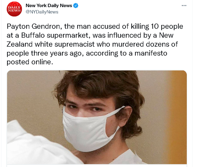 对此,“纽约每日新闻”网站的一篇报道透露,在作案前,根德伦疑似在网上发布了一份180页的作案行动计划书,其中他不仅大谈特谈自己的“白人至上主义”极端思想,还提到他此次作案是受到2019年在新西兰基督城的清真寺里屠杀了51人的澳大利亚白人恐怖主义分子布兰顿·塔兰特(Brenton Tarrant)的影响。