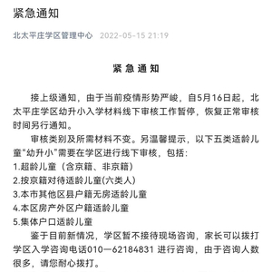 新京报讯(记者杨菲菲)“由于当前疫情形势严峻,自5月16日起,幼升小入学材料线下审核工作暂停,恢复正常审核时间另行通知。”5月15日晚,北京海淀区北太平庄学区管理中心、上庄西北旺学区管理中心、西三旗学区管理中心、温泉苏家坨学区管理中心、四季青学区管理中心等多个学区管理中心均发布了上述通知。