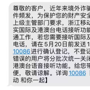 近日,有部分网友反映收到了来自中国移动浙江的短信,内容称将默认关闭接听国际及港澳台电话。“近年来境外诈骗电话案件频发,为保护财产安全,根据上级主管部门要求,浙江移动全面落实国际及港澳台电话接听功能按需开通工作。”