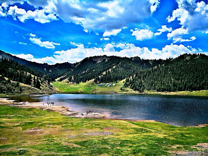 我盼望着在天山大峡谷的天鹅湖畔,能够和这群白色精灵再度相逢,细述满腹的思念,倾诉久蓄的絮语。中巴车忽而疾驰,忽而缓行,终于攀升到海拔2600米,越过一道山梁,眼前豁然开朗,倏忽间就撞见了渴念的天鹅湖。举目四顾,湖面相当于四五个足球场那么大,湛蓝的湖水,蓝得不能再蓝,蕴含着冰清玉洁的气质;皎洁的雪峰,白得不能再白,彰显出高标孤绝的格调;密立的杉木,绿得不能再绿,营造出深沉幽静的意境。