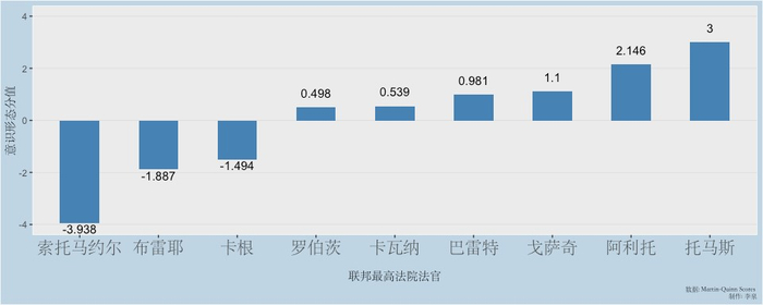 高院分配一个判决的主笔法官的原则是,如果首席大法官处于多数派一边,就由首席大法官指定;如果首席大法官处于少数派一边,就由多数派中资历最老的法官来指派。下图是美国政治学界对大法官意识形态倾向的最新测量值。负分越高,自由派倾向越强,反之,正分越高,则保守派的倾向越强。