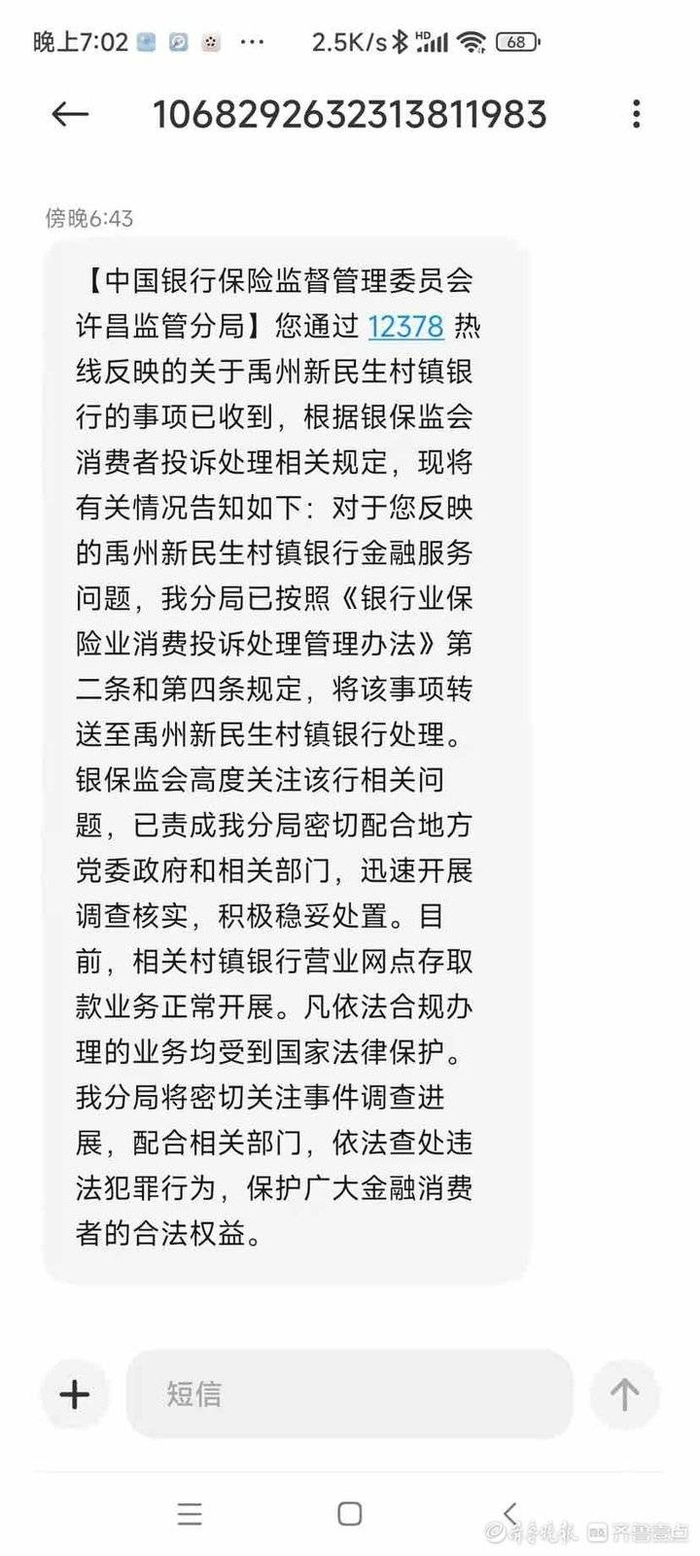 5月12日,任先生收到了银保监会许昌监管分局的短信回复,任先生曾在4月25日打电话反映过问题。回复称,银保监会许昌监管分局已经按照相关规定,将该事项转送至禹州新民生村镇银行处理。